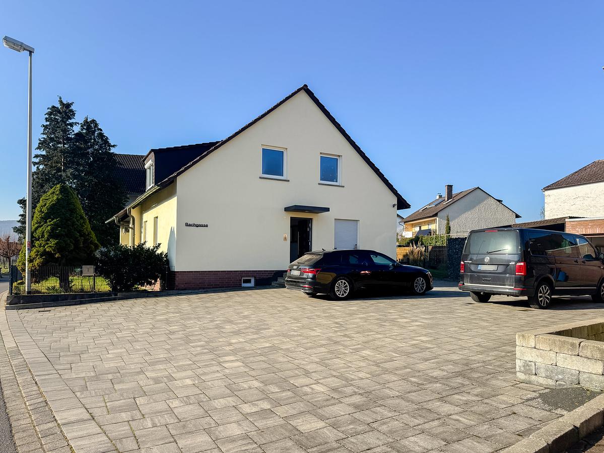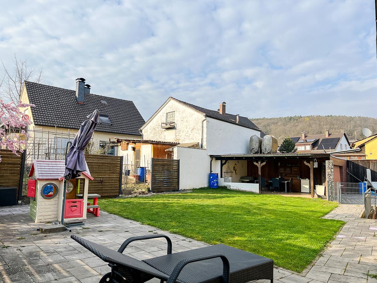 Auch der Außenbereich überzeugt: Ein schöner Garten, eine Garage sowie der große Hof mit zahlreichen Stellplätzen bieten viel Platz und flexible Nutzungsmöglichkeiten.