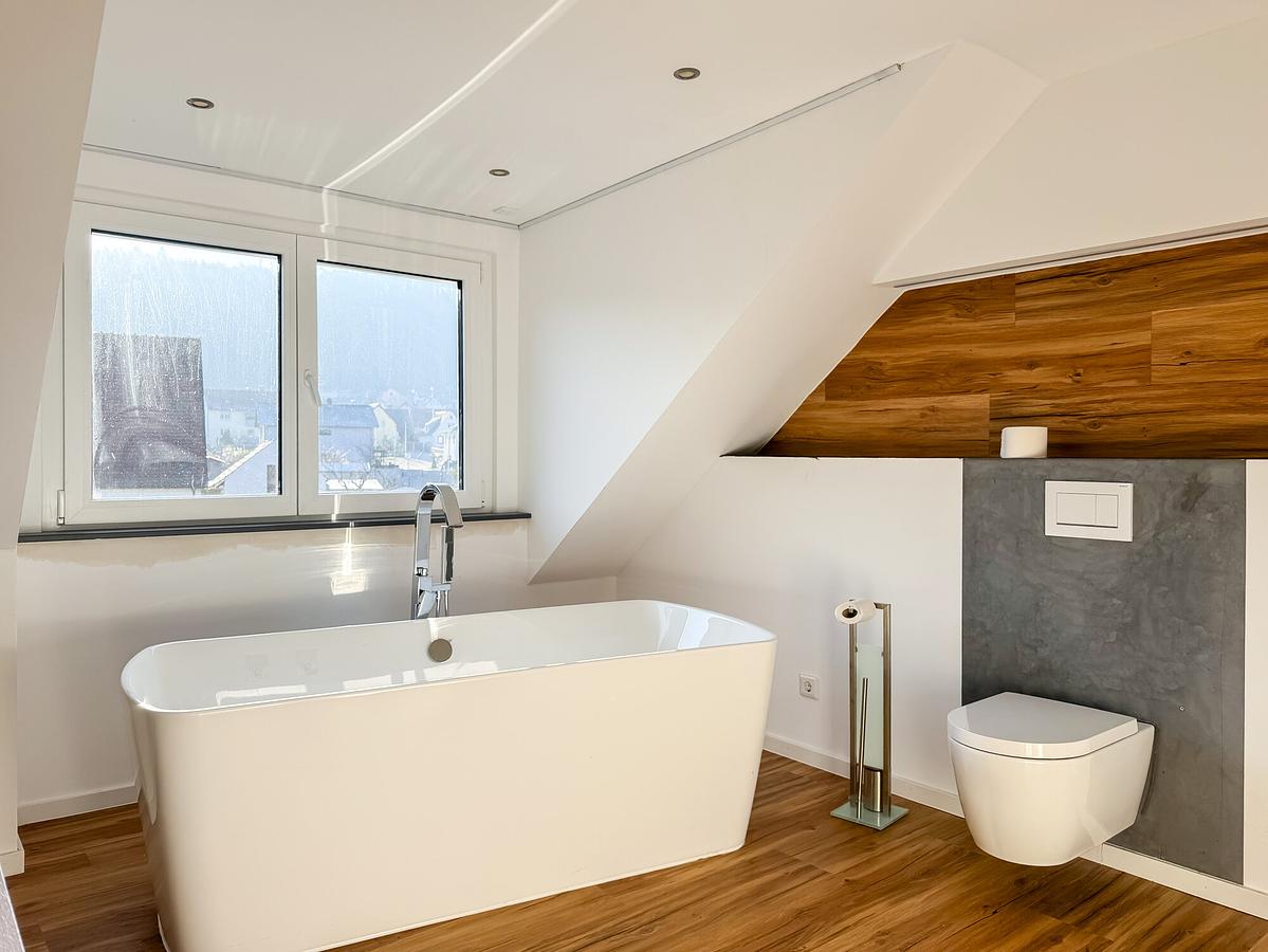Das Dachgeschoss bietet ideale Voraussetzungen für Familien: Zwei nahezu gleich große Kinderzimmer, ein großzügiges Schlafzimmer sowie ein modernes Badezimmer mit freistehender Badewanne, großer bodengleicher Dusche und Doppelwaschbecken schaffen eine komfortable Wohnsituation.