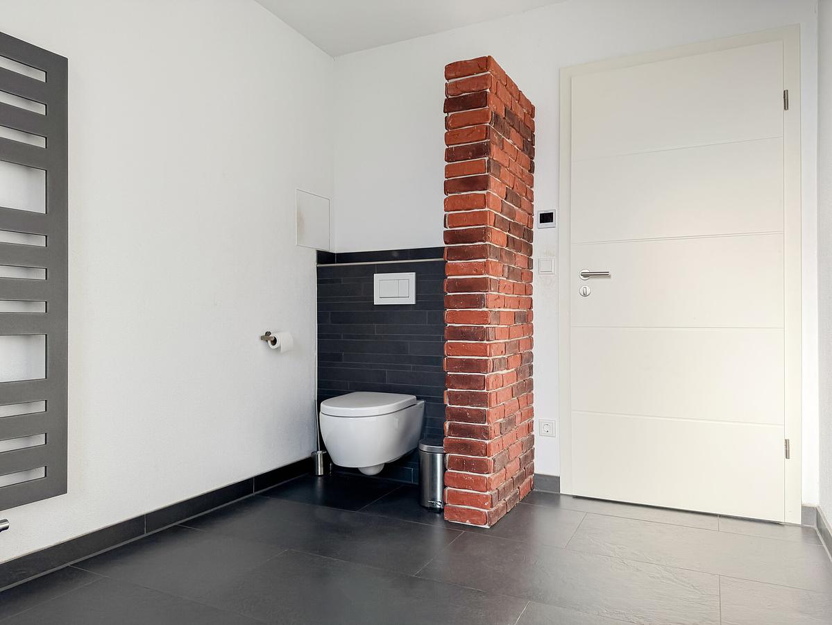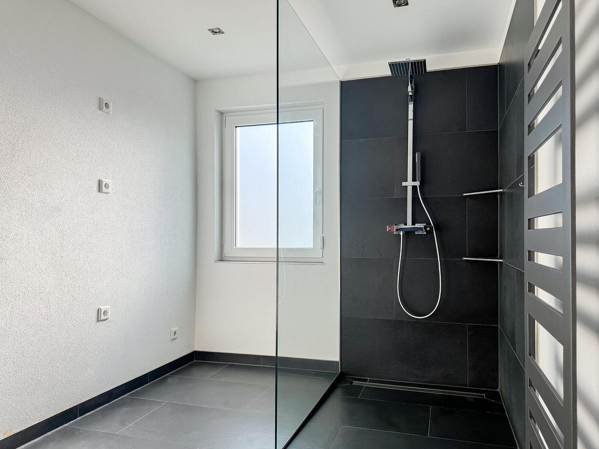 Im Erdgeschoss befinden sich außerdem ein Büro, ein Badezimmer mit ebenerdiger Dusche sowie ein praktischer Abstellraum. Ein Wäscheabwurfschacht führt direkt in den Keller und sorgt für zusätzlichen Komfort im Alltag.