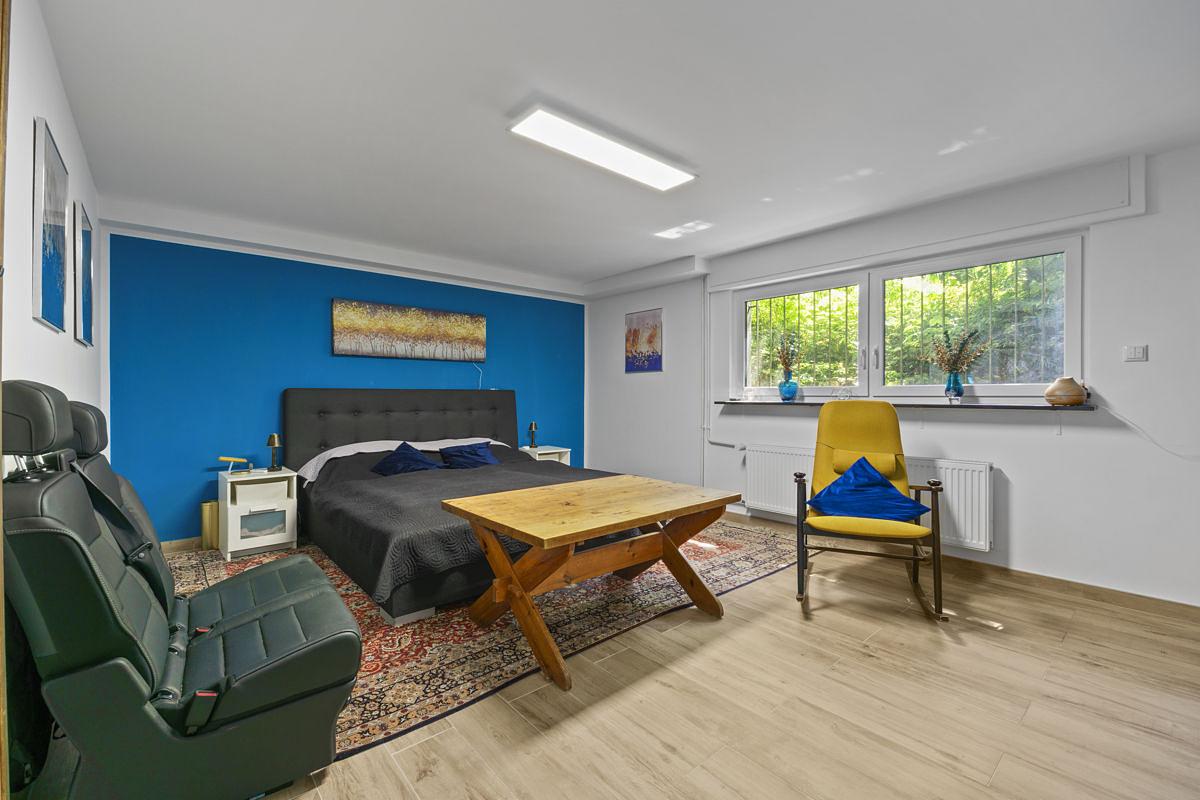 Ein Wäscheschacht mit direktem Zugang ins Untergeschoss erleichtert die Hausarbeit erheblich. Hier befinden sich auch das Gästezimmer, ein weiteres Bad mit großzügiger Wanne sowie ein zusätzlicher Wohnraum, der ideal als Arbeitszimmer oder für Home-Office genutzt werden kann.