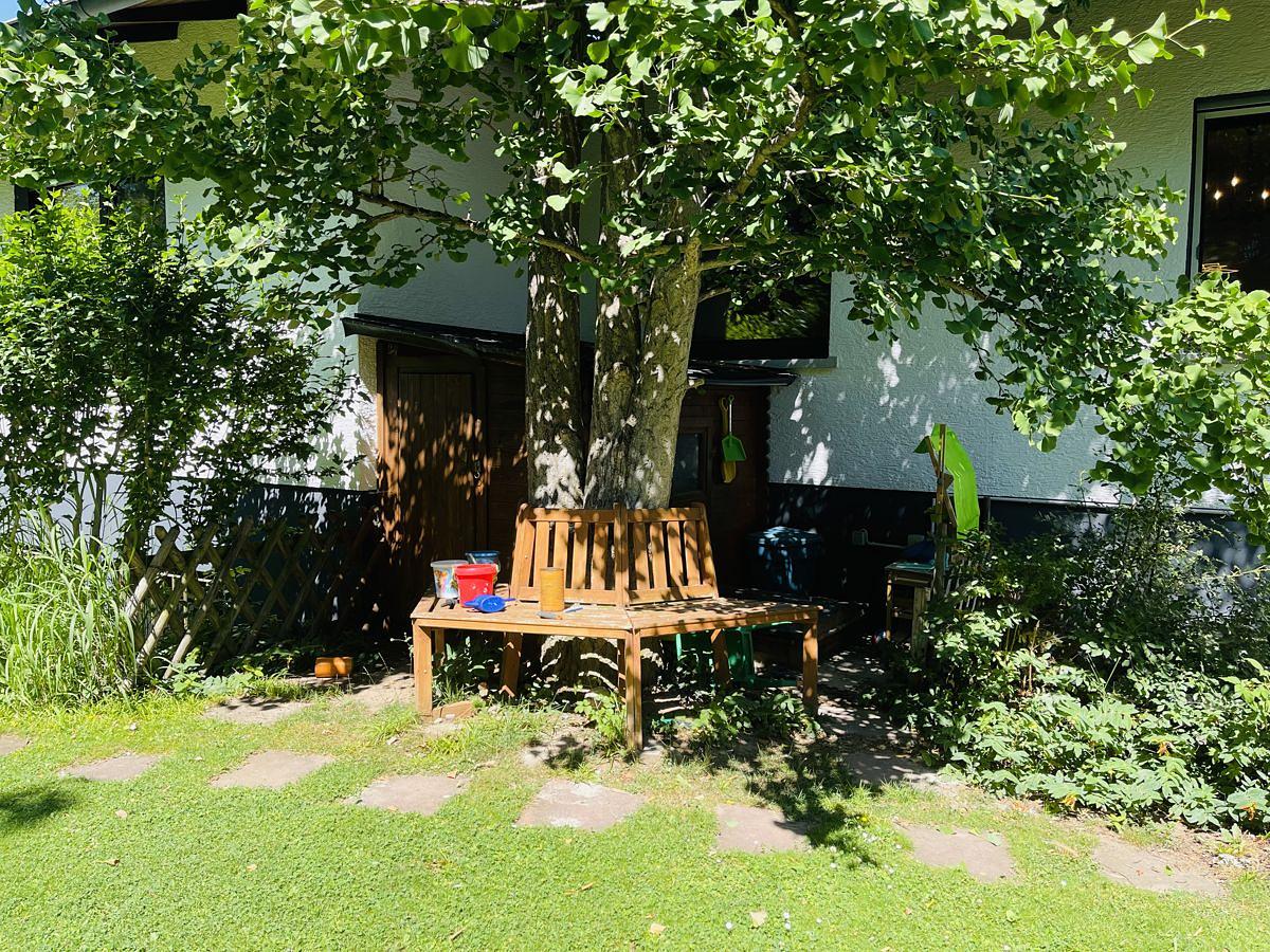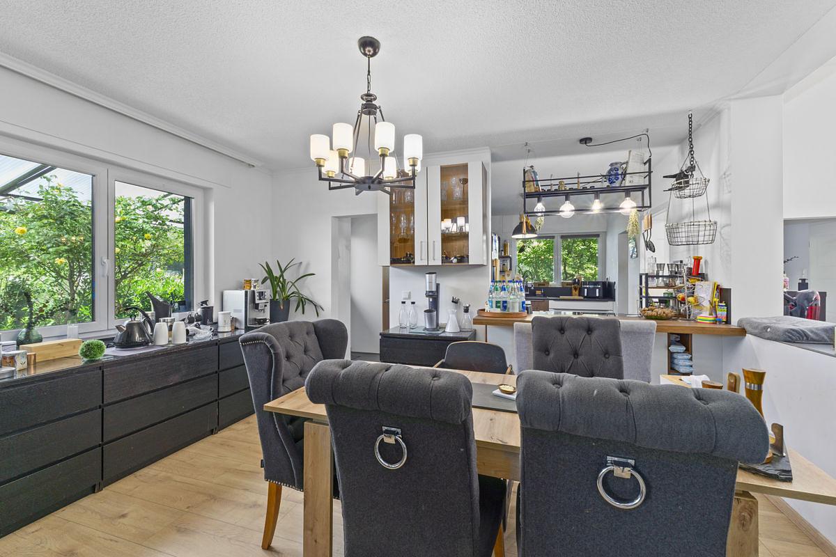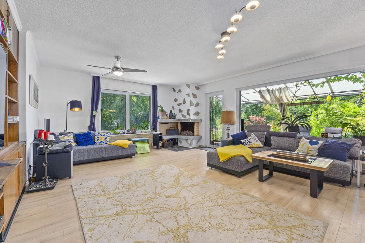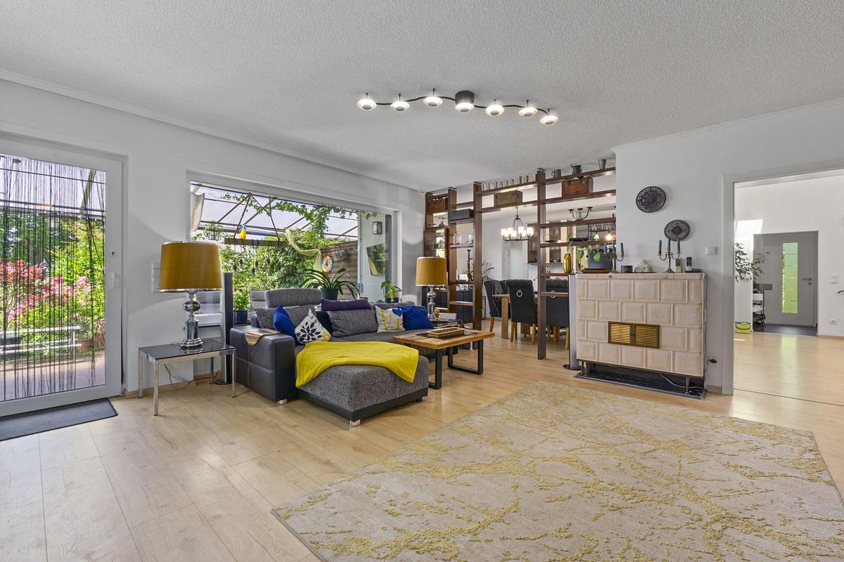Das Wohnzimmer führt ebenerdig auf die Terrasse, die nur wenige Stufen vom Garten entfernt ist. Trotz der großzügigen Grundfläche des Hauses bietet das ca. 896 m² große Grundstück ausreichend Grünflächen im Freien – ideal für Kinder, Gartenliebhaber oder entspannte Stunden im Freien.