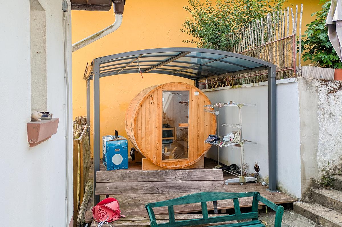 Komplettiert wird unser Angebot von dem großen Hang- / Gartenbereich hinter dem Haus mit schöner Aussicht und Süd-Lage – hier lässt sich das eine oder andere Plätzchen zum Chillen, Feiern oder für einen Nutzgarten anlegen – und hier befinden sich auch ein Terrassendeck sowie die kleine Außensauna. Komplettiert wird das Ganze von dem auf der anderen Straßenseite liegende Garagentrakt mit Platz für 2 Fahrzeuge und einem großen Bereich, nutzbar z.B. für eine Werkstatt.
