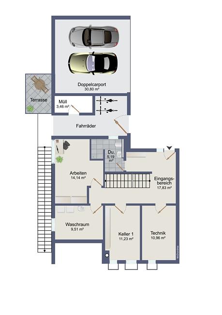 Zwei Carport-Stellplätze schützen die Fahrzeuge vor Witterungseinflüssen, ein Anbau schafft Platz für Fahrräder und Mülltonnen.