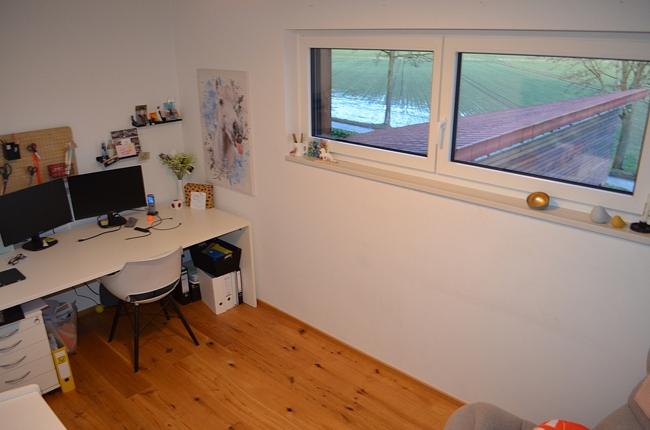 Im Erdgeschoss öffnet sich der großzügig gestaltete Wohn-, Ess- und Kochbereich mit großen Fensterflächen. Die Küche ist mit einer neuwertigen Einbauküche von 2023 ausgestattet. Vom Wohn- und Essbereich erreichen Sie direkt die sonnige Südwest-Terrasse. Ein weiteres Zimmer im Erdgeschoss eignet sich ideal als Kinderzimmer. Das Obergeschoss bietet drei weitere Schlafzimmer sowie ein Badezimmer.