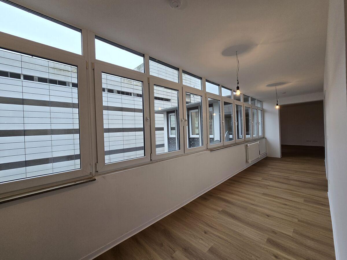 Ein weiteres Highlight ist die Dachterrasse, die teilweise überdacht ist und zusätzlichen Außenraum bietet. Von hier sowie von den rückwärtigen Räumen blickt man in Richtung Innenhof. Zur Vorderseite hin sorgt eine große Fensterfront für viel Tageslicht und einen offenen Blick auf die Einkaufspassage.