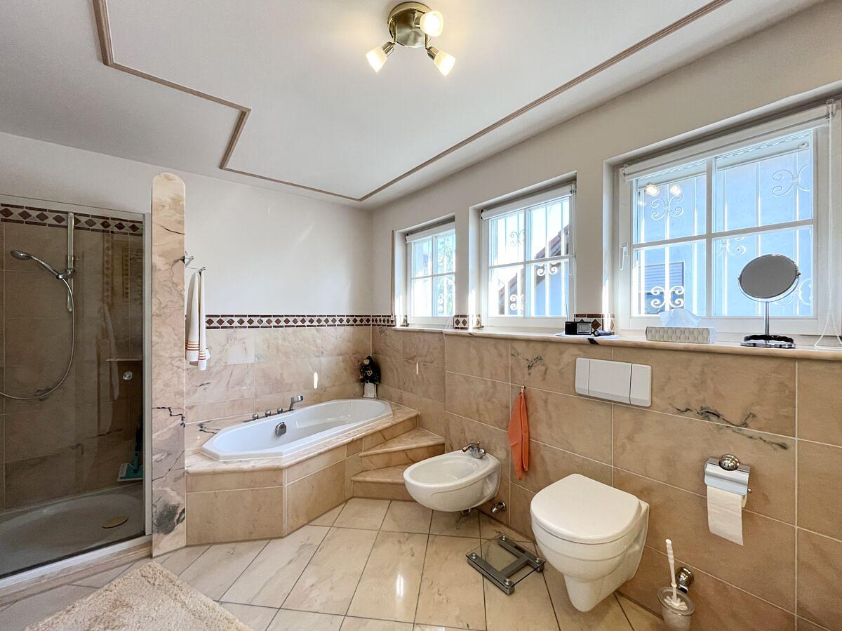 - marmoriertes Tageslichtbad (Dusche und Badewanne)