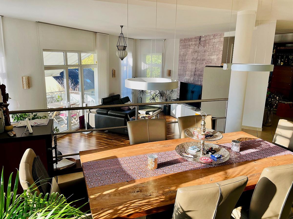 Das Haupthaus bietet rund 190 m² Wohnfläche und besticht durch eine großzügige, durchdachte Raumaufteilung sowie helle, repräsentative Räume. Der offen gestaltete Wohn- und Essbereich bildet das Herzstück des Hauses und führt direkt auf die wundervolle Terrasse, von der aus sich ein weiter Blick in die umliegende Natur eröffnet. Harmonisch in den Wohnbereich integriert befindet sich die hochwertige, werthaltige Einbauküche der renommierten Marke LEICHT, die mit zeitlosem Design, exzellenter Verarbeitung und hoher Funktionalität überzeugt und den gehobenen Anspruch dieser Immobilie unterstreicht.